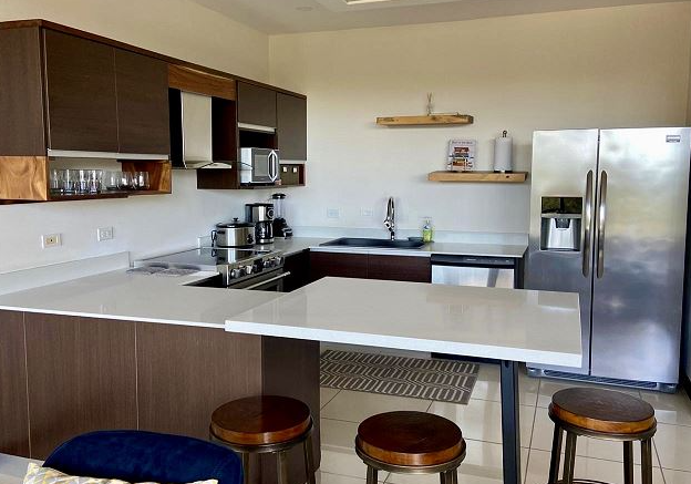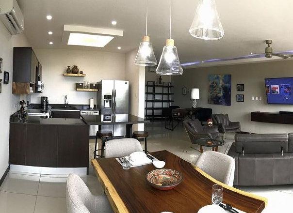 This contemporary two-bedroom apartment is situated in the heart of Playa Hermosa, Guanacaste and is only a five-minute walk from the beach. There are views of the ocean from the master bedroom and roof-top deck.